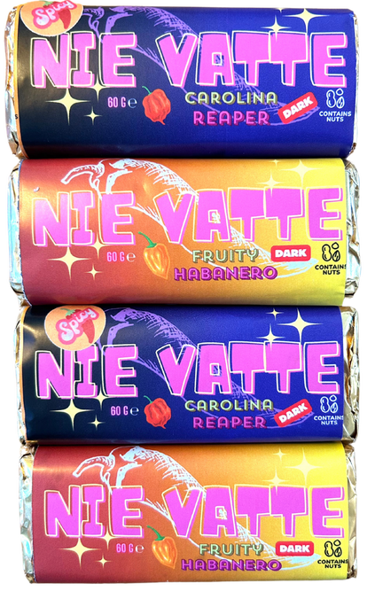My ingrediënts: Rich chocolate, almonds, cashew-, hazel-, pecan nuts, cranberries, pinch of salt, Habanero pepper (±300.000 SHU) or Carolina Reaper (>1.500.000 SHU)